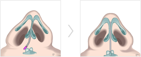 Выполняется коррекция путем выпрямления хряща носовой перегородки, хрящ переносицы отделяется от хряща носовой перегородки и сшивается снова для корректировки. - Если носовая перегородка сильно искривлена, то: