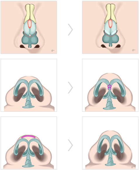 Во время ринопластики хирург открывает структуру носа, разъединяет ее элементы для того, чтобы каждый из них был доступен для работы. Затем удаляет то, что необходимо удалить и моделирует новую форму носа. После того, как новая структура собрана, она укрепляется для того, чтобы сохраниться на всю жизнь.
